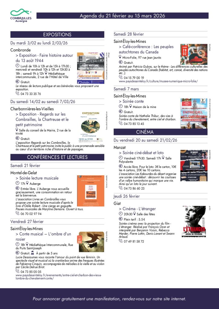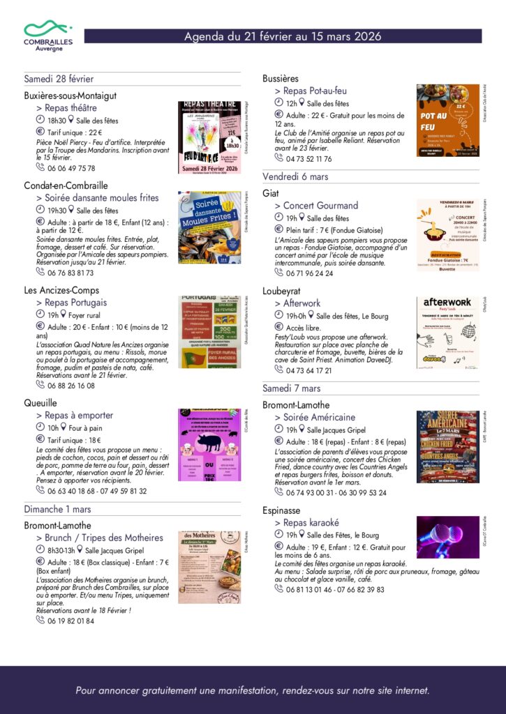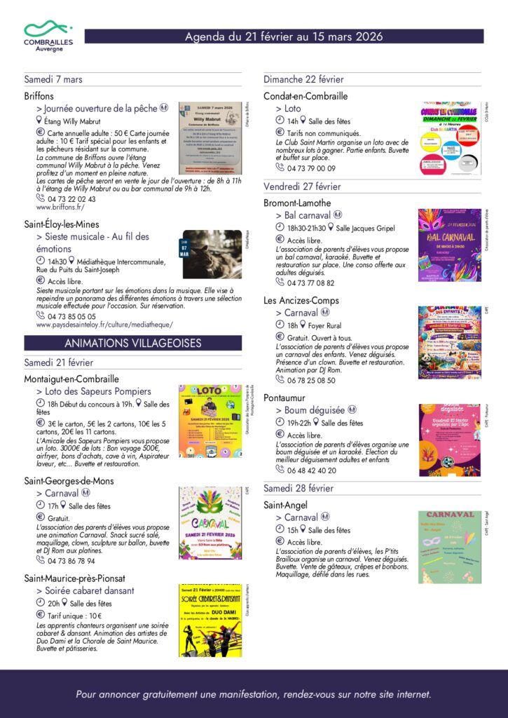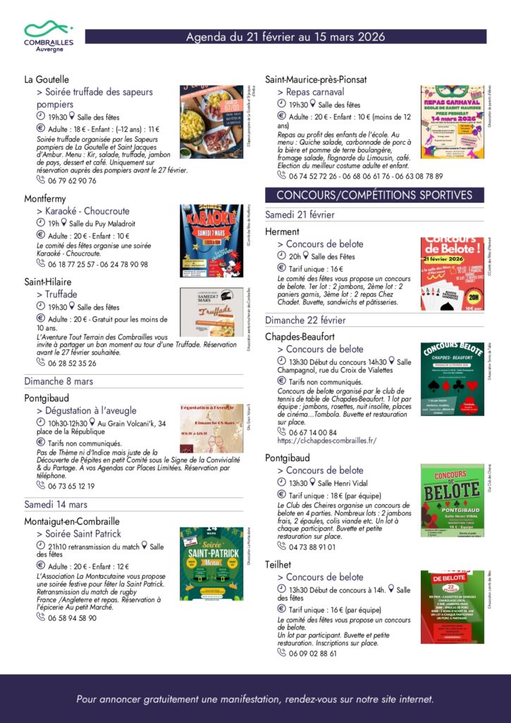 Veuillez trouver ci-dessous l’agenda des manifestations du 21 février au 15 mars 2026.