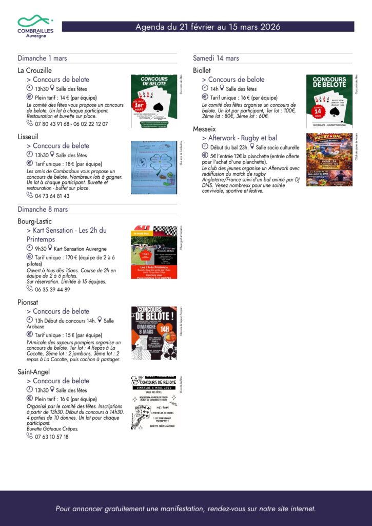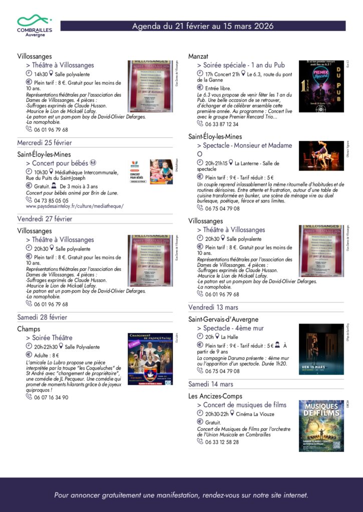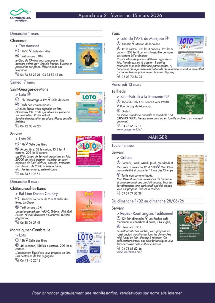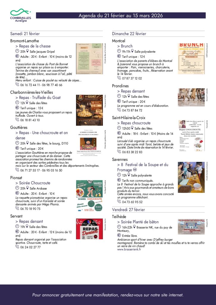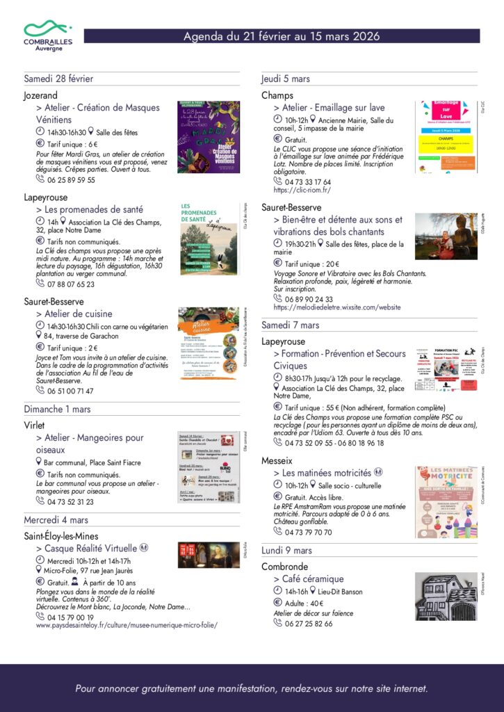 Veuillez trouver ci-dessous l’agenda des manifestations du 21 février au 15 mars 2026.
