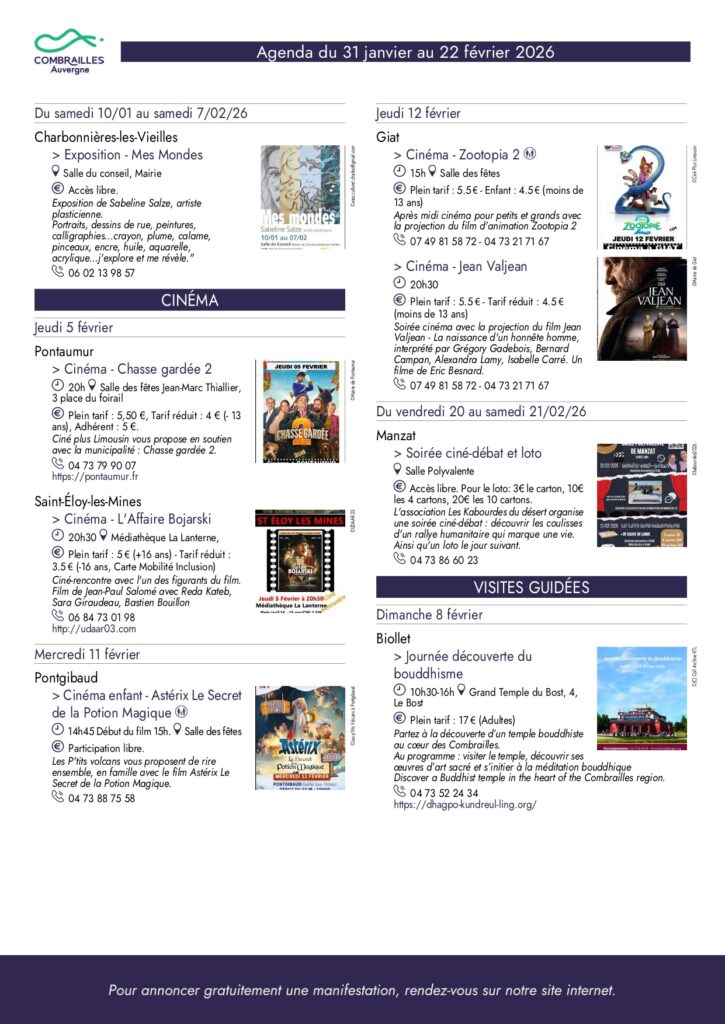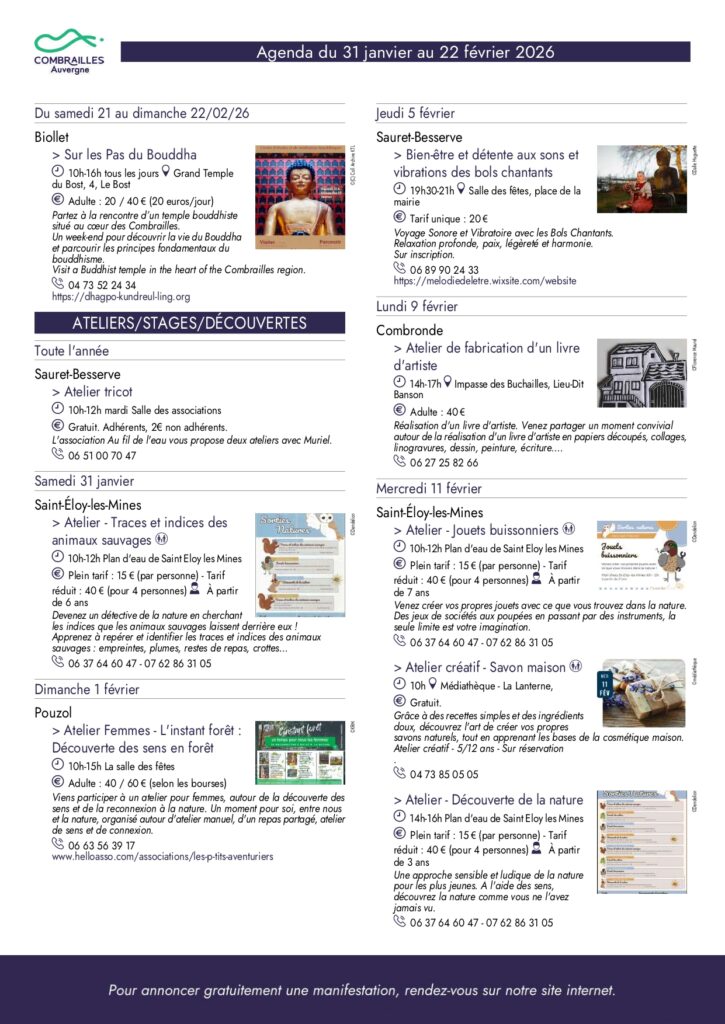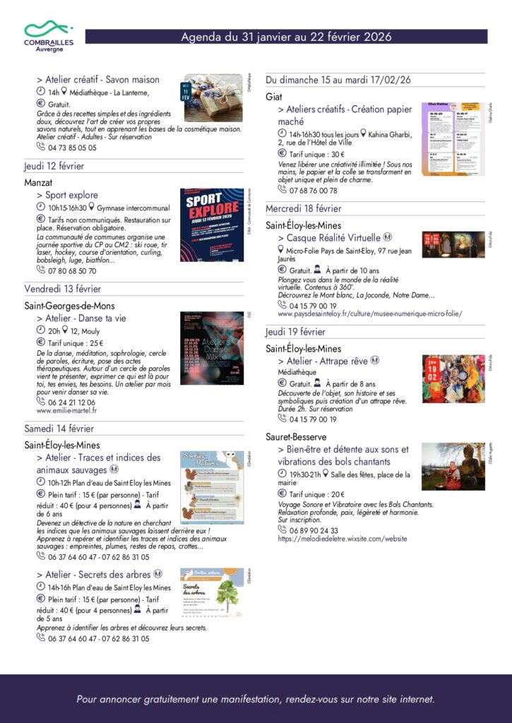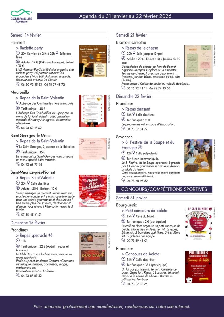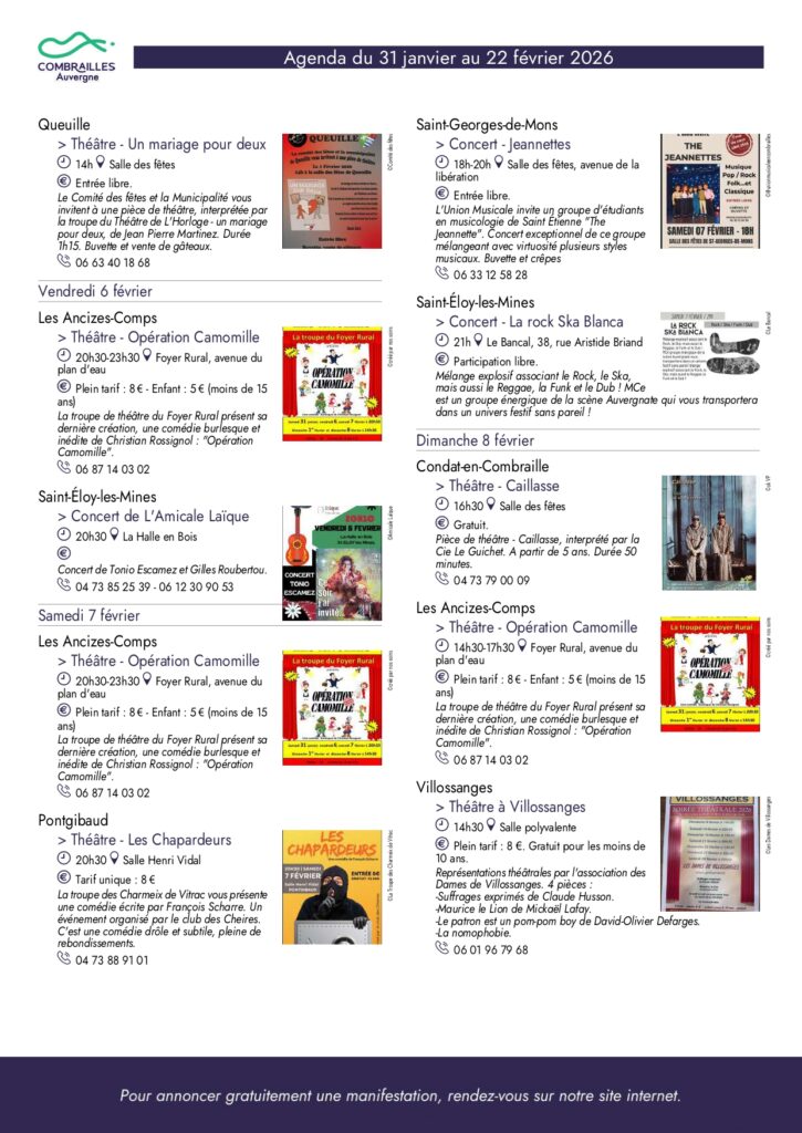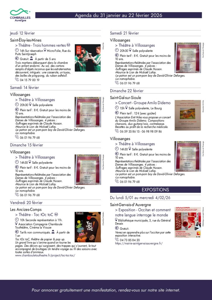 Agenda des Combrailles du 31 janvier au 22 février 2026