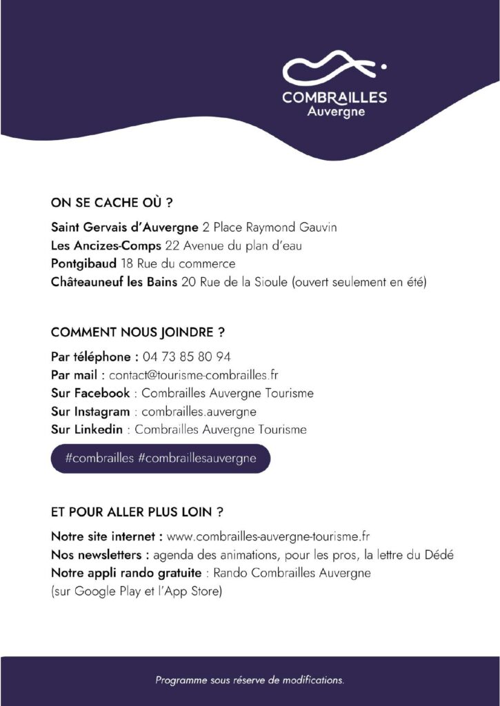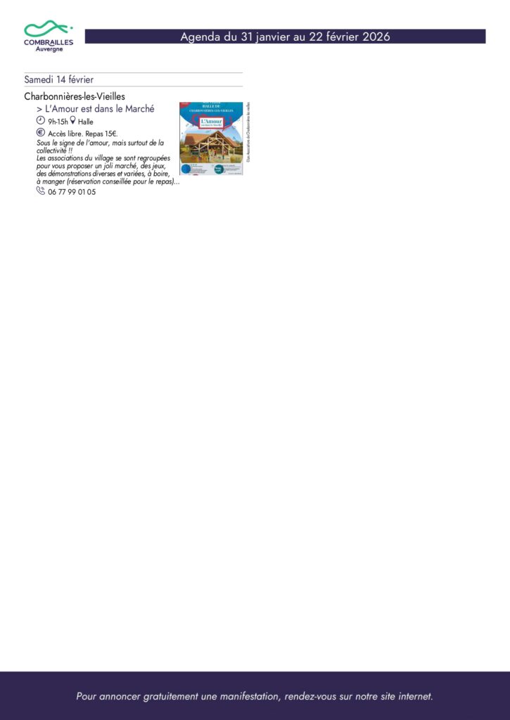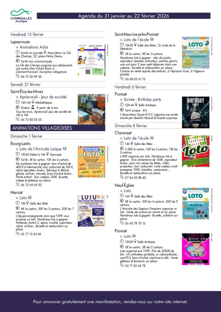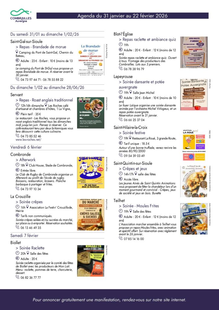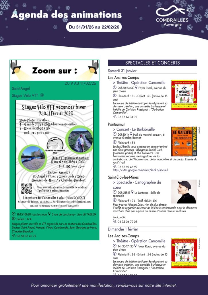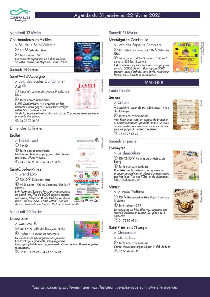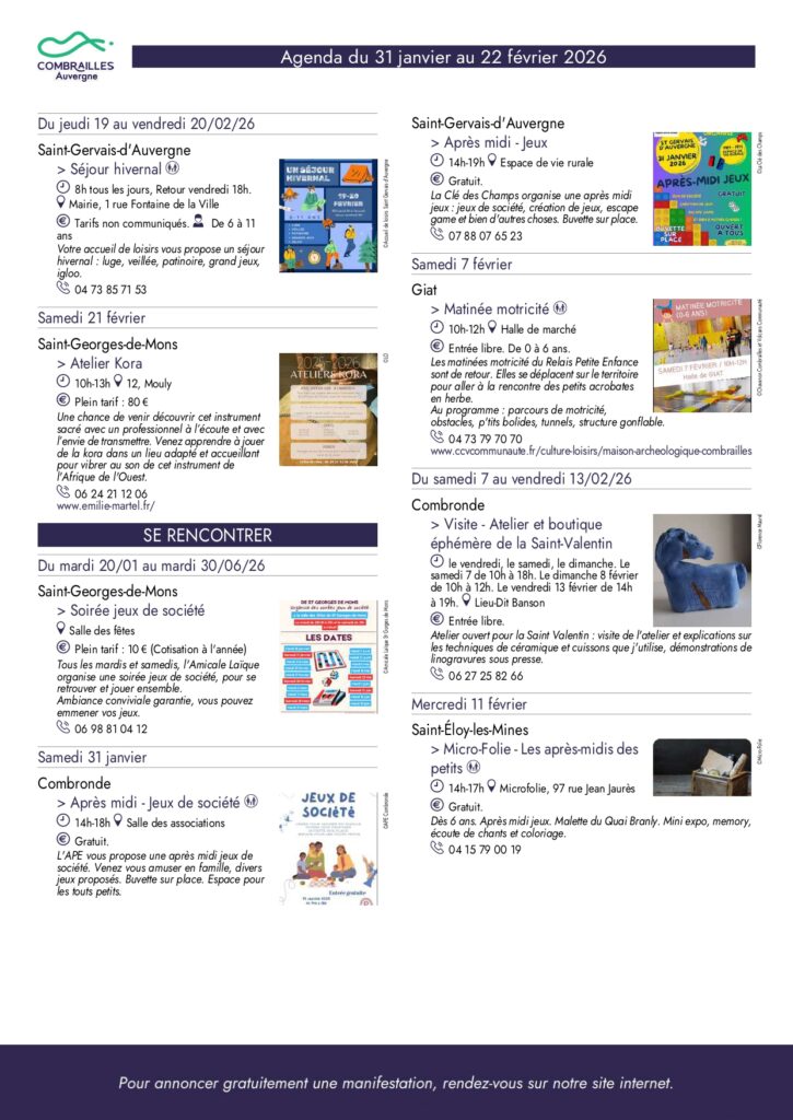 Agenda des Combrailles du 31 janvier au 22 février 2026