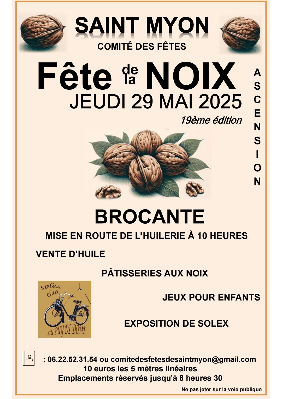 Le comité des fêtes de Saint-Myon organise la fête de la noix le jeudi 29 mai 2025.
