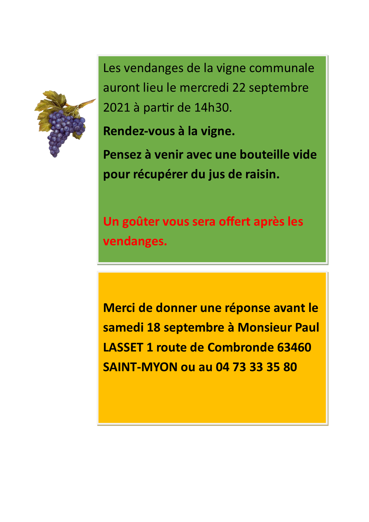 Merci de donner une réponse avant le samedi 18 septembre à Monsieur Paul LASSET 1 route de Combronde 63460 Saint-Myon ou au 04-73-33-35-80
