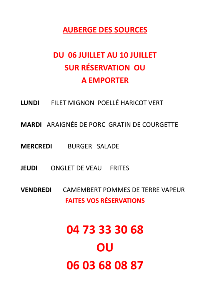 Auberge des sources menu du 06 au 10 juillet 2020 Veuillez trouver ci dessous le menu du 06 au 10 juillet 2020 Partager : Communauté