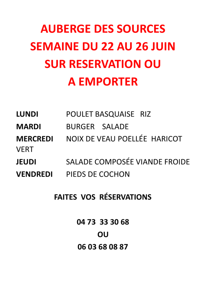 Auberge des Sources menu du 22 au 26 juin 2020 Veuillez trouver ci-dessous le menu de l’auberge des Sources du 22 au 26 juin 2020 Partager : Communauté