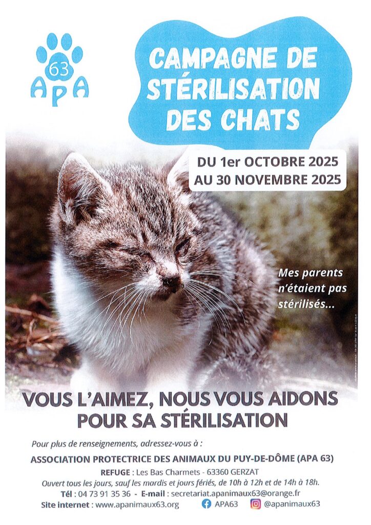 L’association Protectrice des Animaux du Puy-De-Dôme (APA 63) organise une campagne de stérilisation des chats du 01er octobre 2025 au 30 novembre 2025.