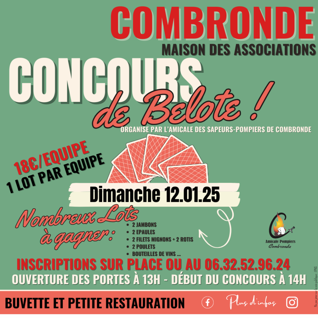 Concours de belote organisé par l’amicale des Sapeurs-Pompiers de Combronde le dimanche 12 janvier 2025 à la Maison des Associations de Combronde