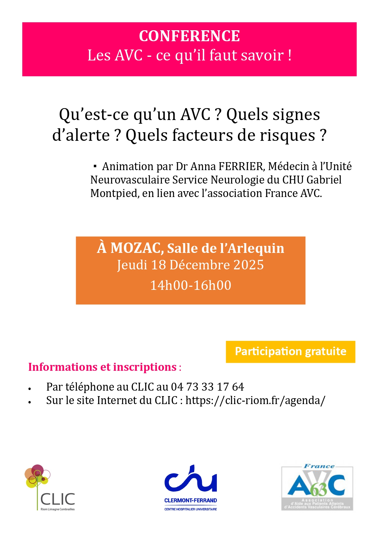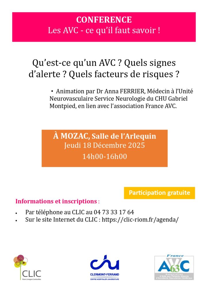 Conférence le jeudi 18 décembre 2025 Les AVC – ce qu’il faut savoir à Mozac, Salle de l’Arlequin de 14h00 à 16h00.