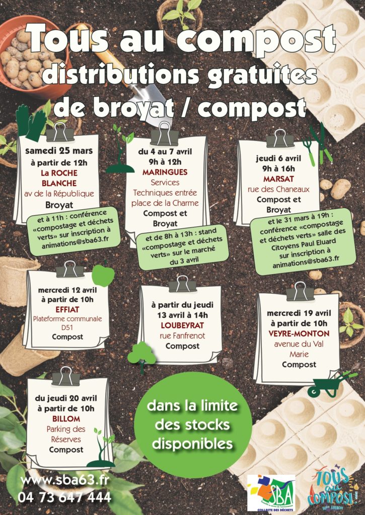 Distributions gratuites de broyat / compost pour plus de renseignements contactez le SBA au 04-73-64-74-44 Partager : Communauté