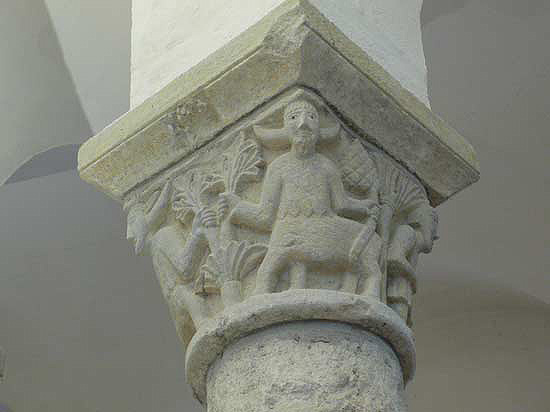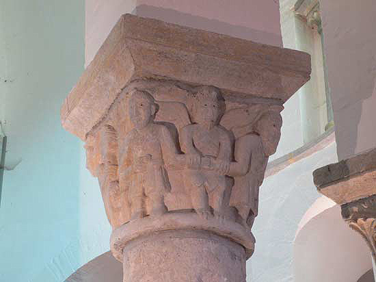 Nous pouvons aussi remarquer un chœur imposant qui conserve des chapiteaux romans de tout beauté, réalisés encore avec le calcaire de Chaptuzat : l’un d’eux représente un curieux pacte mené avec le diable, un démon ailé qui joint les mains des deux personnages de la scène ; les autres thèmes figuratifs illustrent la punition de l’avare, l’élévation au ciel de l’âme du juste, des griffons et le mythe du minotaure, le taureau à visage humain de la légende, muni d’oreilles animale et de puissantes cornes…On retrouve dans le narthex le fameux « in folio »qui figure toujours à cet endroit dans de nombreux édifices auvergnats : Manglieu, N.D. du Port à Clermont-Fd, St-Julien de Chauriat etc…il s’agirait de la représentation des livres saints, destinés à « ouvrir les yeux » aux catéchumènes, ces apprentis au baptême qui se tenaient dans le narthex selon les anciennes pratiques.