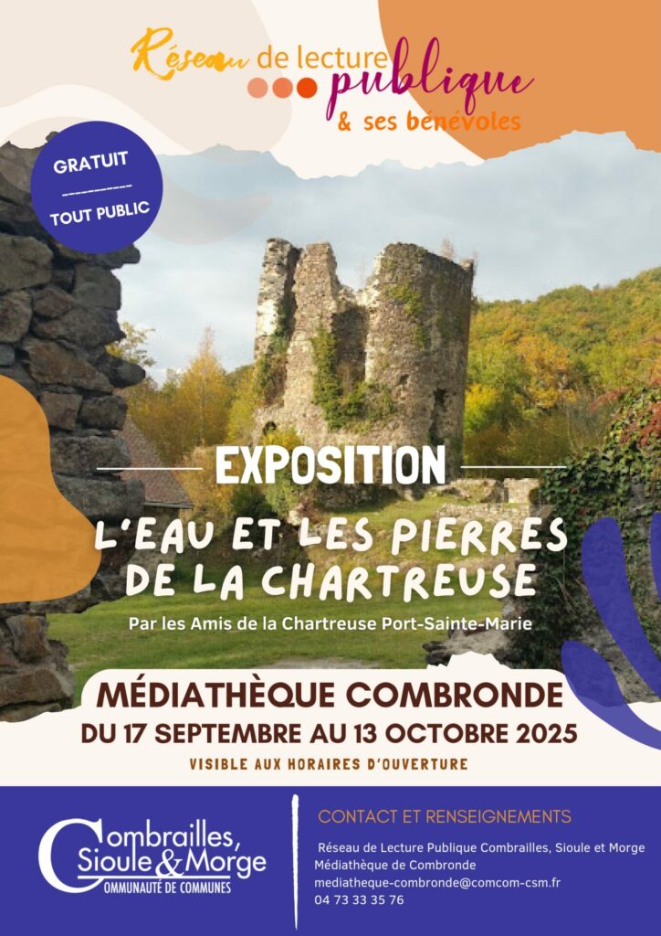Le Réseau de Lecture Publique de la communauté de communes Combrailles, Sioule et Morge vous invite à découvrir L’Eau et les Pierres de la Chartreuse, une exposition des œuvres du concours 2024. Cette exposition sera visible du 17 septembre au 13 octobre 2025, aux horaires d’ouverture de la médiathèque de Combronde. A travers les œuvres d’artistes amateurs, venez découvrir le cadre naturel de la Chartreuse où faune et flore lui donnent aujourd’hui son caractère si singulier. Renseignements
