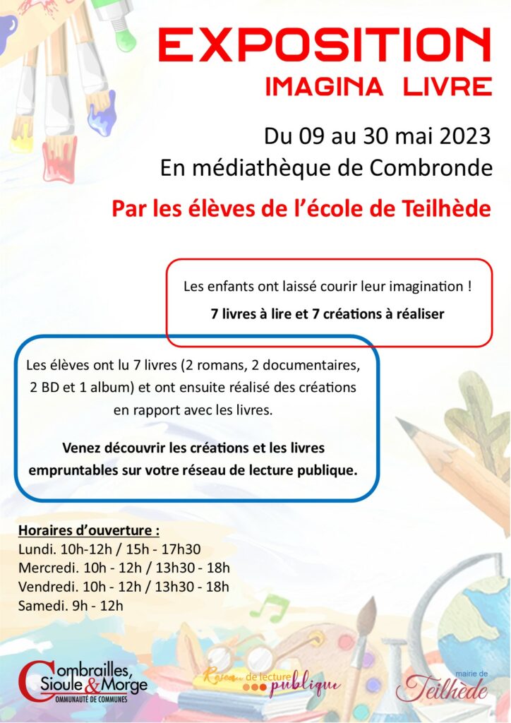 Exposition Imagina Livre du 09 au 30 mai 2023 en médiathèque de Combronde, par les élèves de l’école de Teilhède.