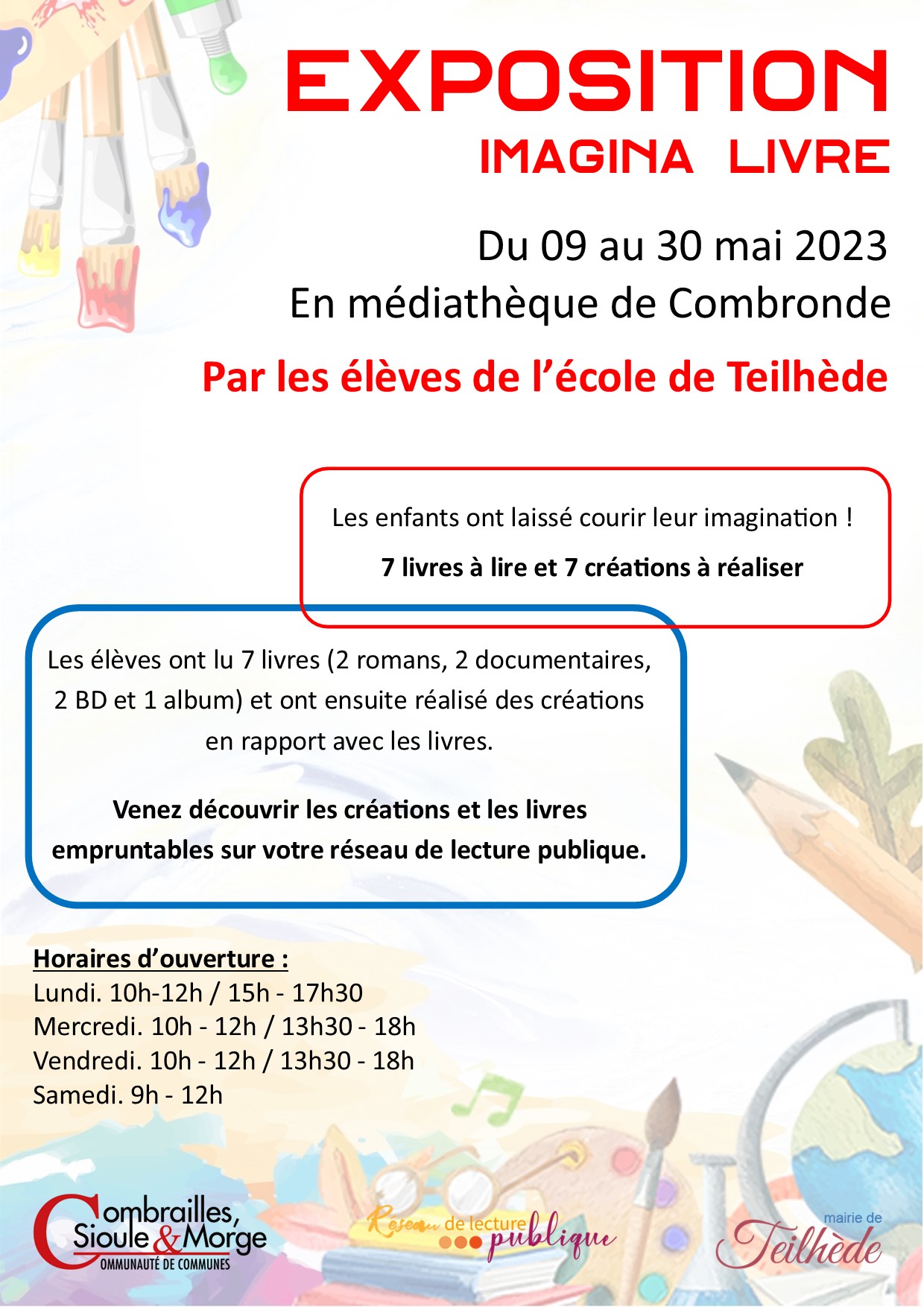 Exposition Imagina Livre du 09 au 30 mai 2023 en médiathèque de Combronde Par les élèves de l’école de Teilhède.