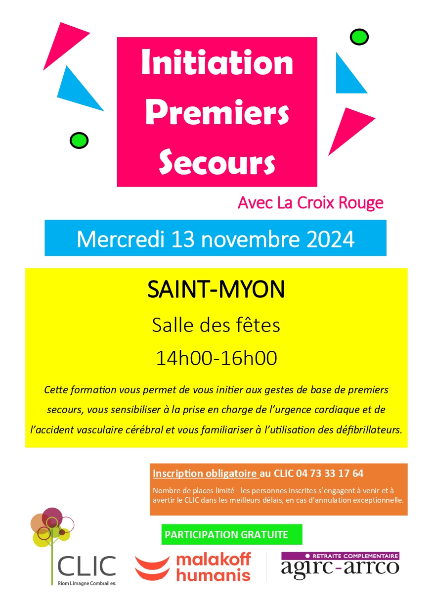 Initiation Premiers Secours avec la Croix Rouge à la salle des fêtes de Saint-Myon le mercredi 13 novembre 2024 de 14h00 à 16h00.