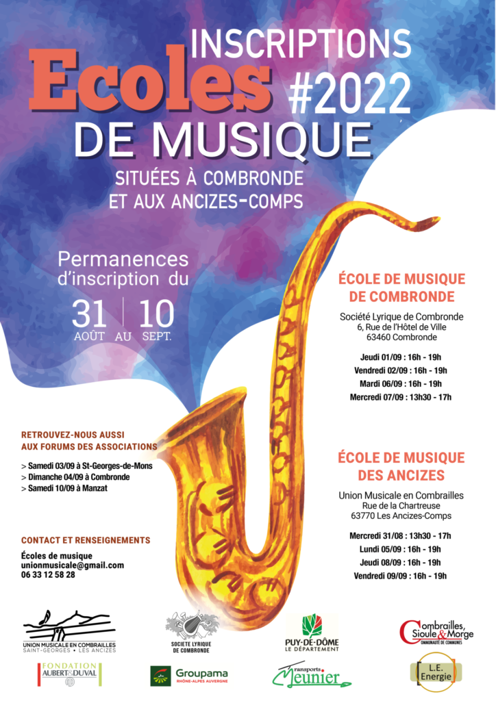 Inscriptions écoles de musique situées à Combronde et aux Ancizes-Comps permanence d’inscription du 31 août au 10 septembre 2022 pour plus de renseignements unionmusicale@gmail.com ou 06-33-12-58-28