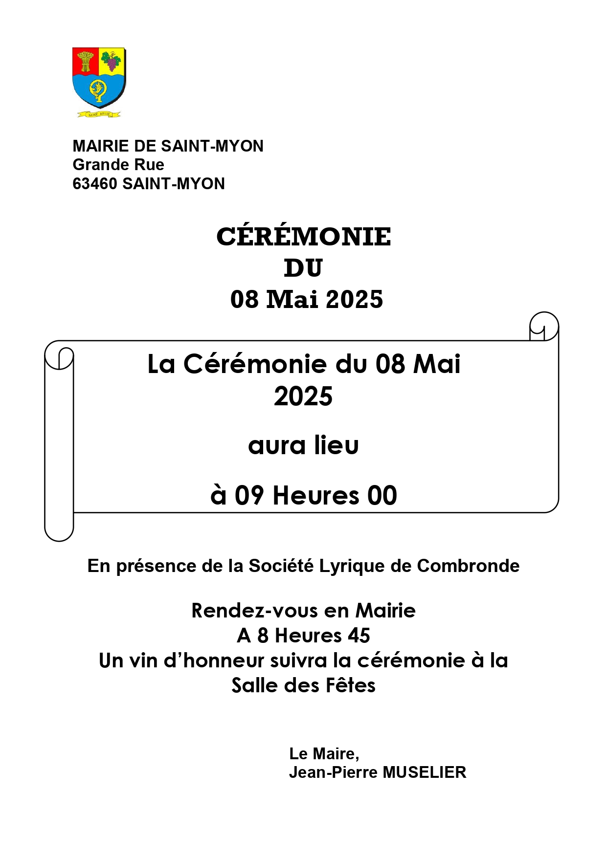 La cérémonie du 08 mai 2025 aura lieu à 09h00, rendez-vous à 08h45 à la Mairie.