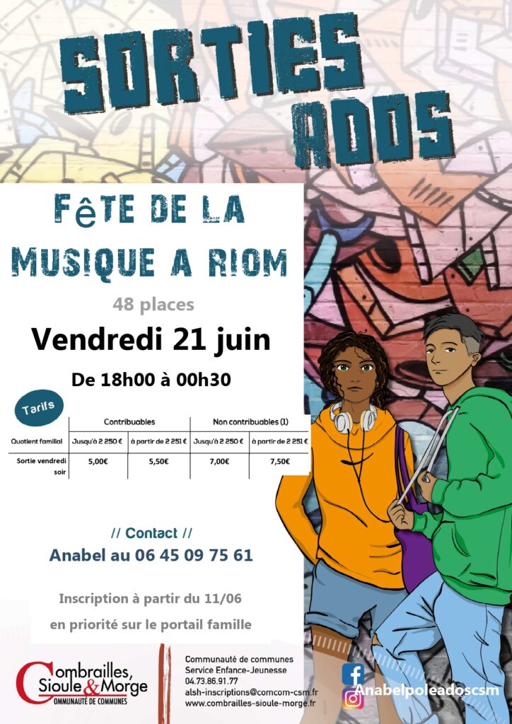 La Communauté de Communes Combrailles Sioule et Morge organise une sortie ados pour la fête de la musique à Riom le vendredi 21 juin de 18h00 à 00h30.