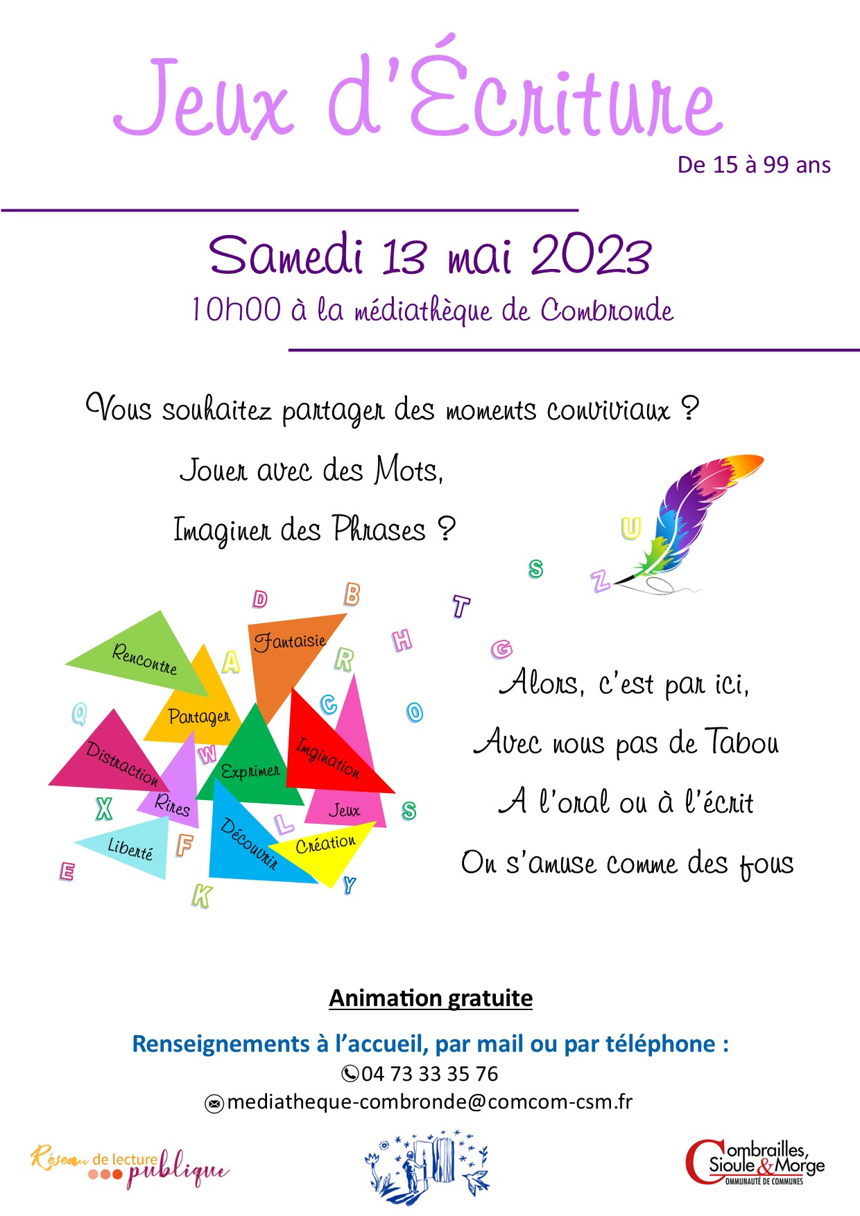 La Communauté de Communes Combrailles Sioule et Morge propose des jeux d’écriture le samedi 13 mai 2023 à 10h00 à la médiathèque de Combronde Partager : Communauté