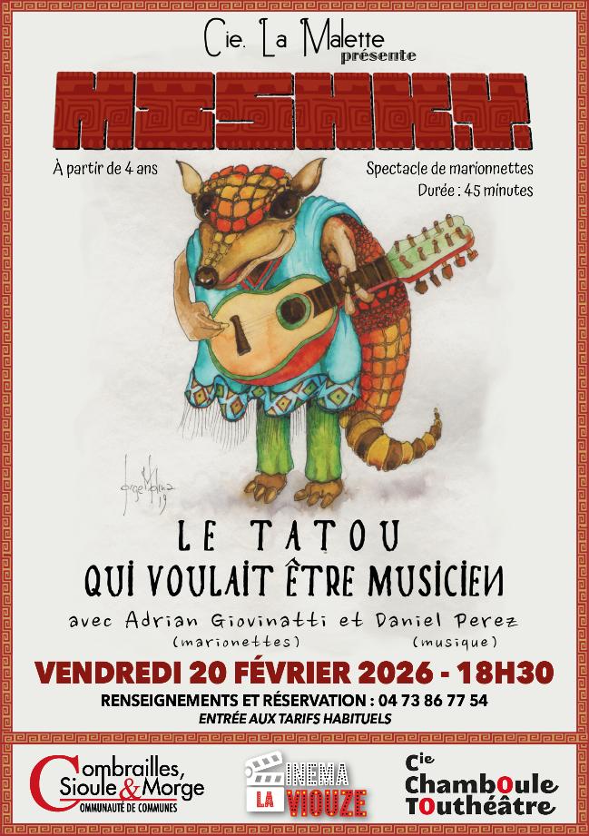 La Compagnie La Malette présente le tatou qui voulait être musicien le vendredi 20 février 2026 à 18h30 au cinéma La Viouze.