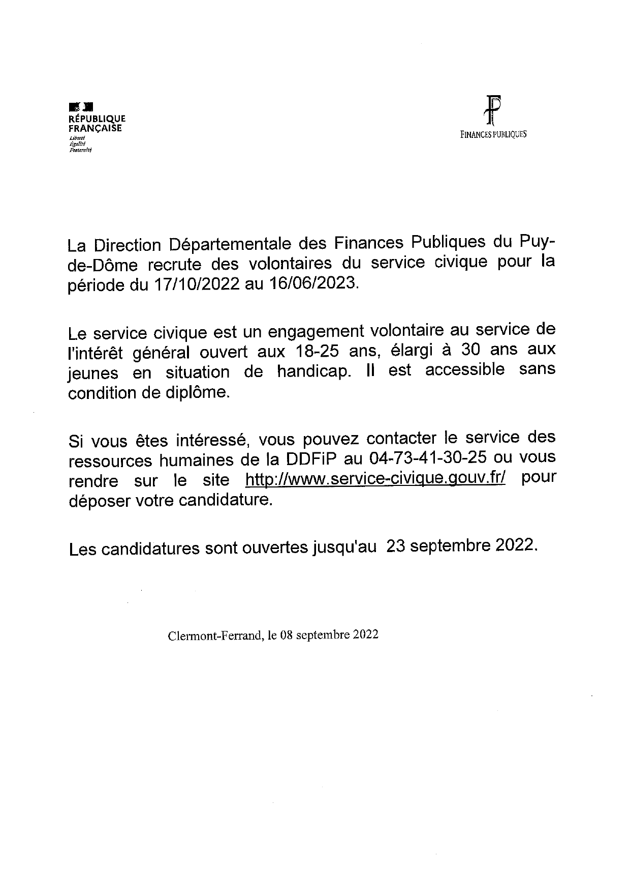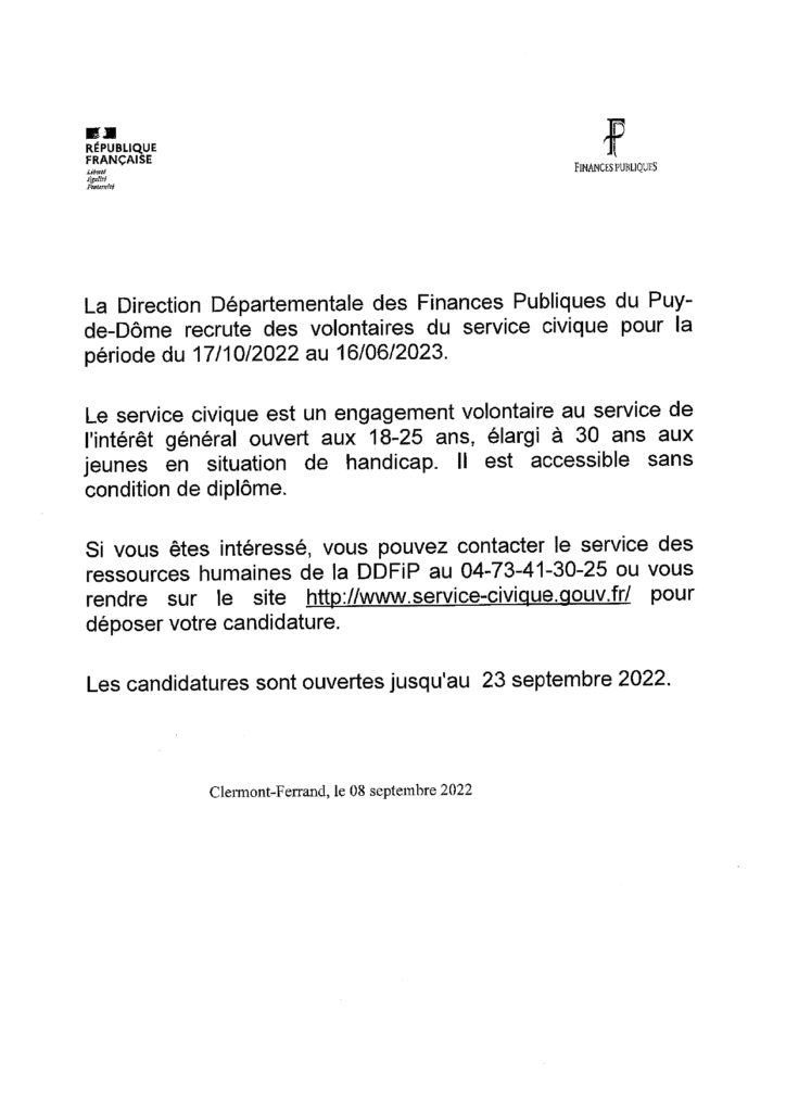 La Direction Départementale des Finances Publiques du 63 recrute des volontaires du service civique pour la période du 17/10/2022 au 16/06/2023. Pour plus d’informations contacter la DDFIP au 04-73-41-30-25 ou se rendre sur le site http://www.service-civique.gouv.fr pour déposer votre candidature.