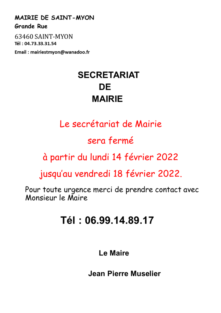 La Mairie sera exceptionnellement fermée du lundi 14 au vendredi 18 février inclus.