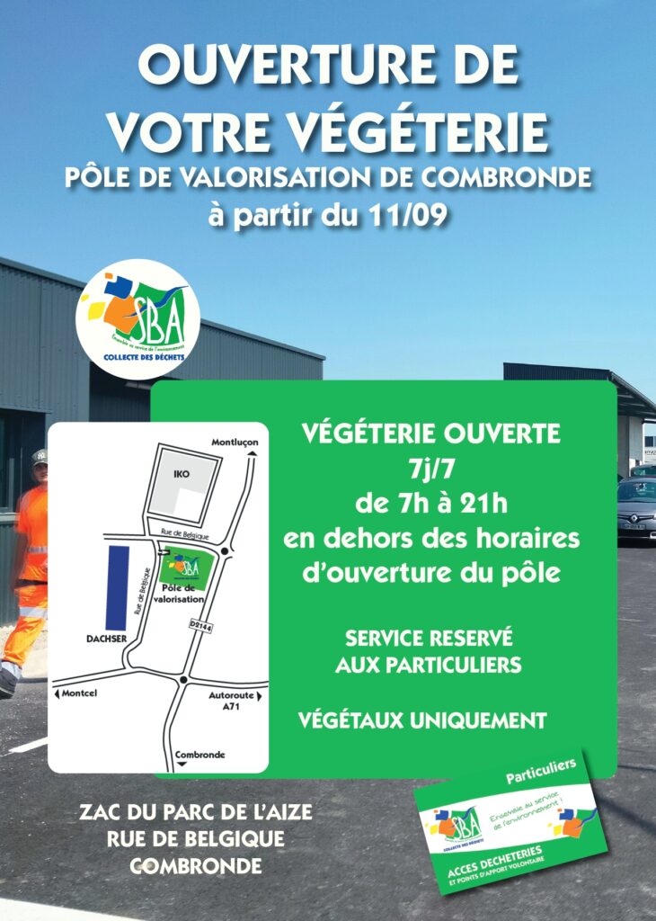 La végéterie du Pôle de valorisation de Combronde sera ouverte à partir du lundi 11 septembre 2023, en accès libre, de 7h à 21h, en dehors des heures d’ouverture du Pôle de valorisation de Combronde. Elle sera accessible 7 jours sur 7 et réservée aux particuliers, sur présentation de la carte d’accès en déchèterie. Seuls les déchets verts pourront y être déposés.