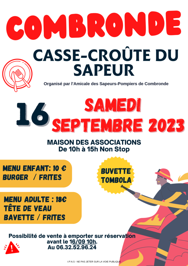 L’amicale des sapeurs pompiers de Combronde vous propose le samedi 16 septembre 2023 le casse croûte du sapeur.