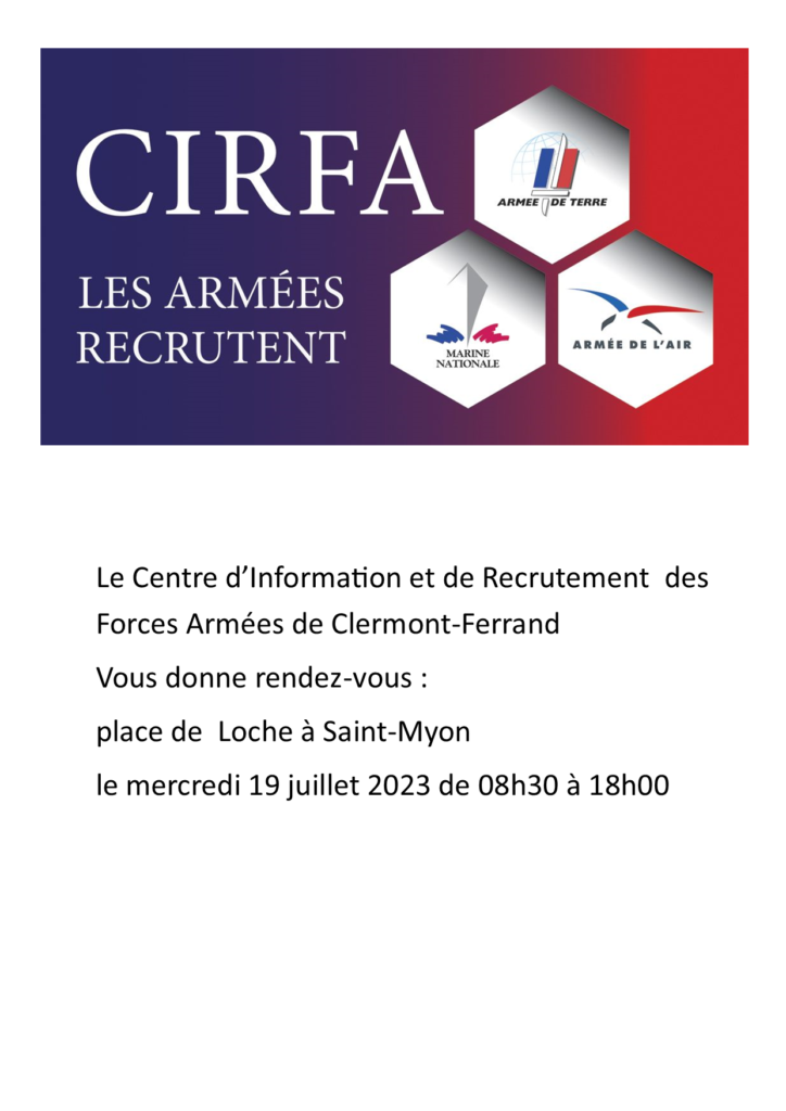 Le Centre d’information et de recrutement des forces armées de Clermont-Ferrand vous donne rendez-vous à Saint-Myon le mercredi 19 juillet 2023