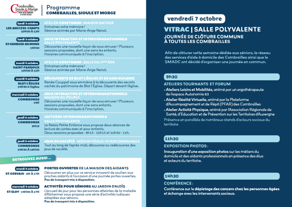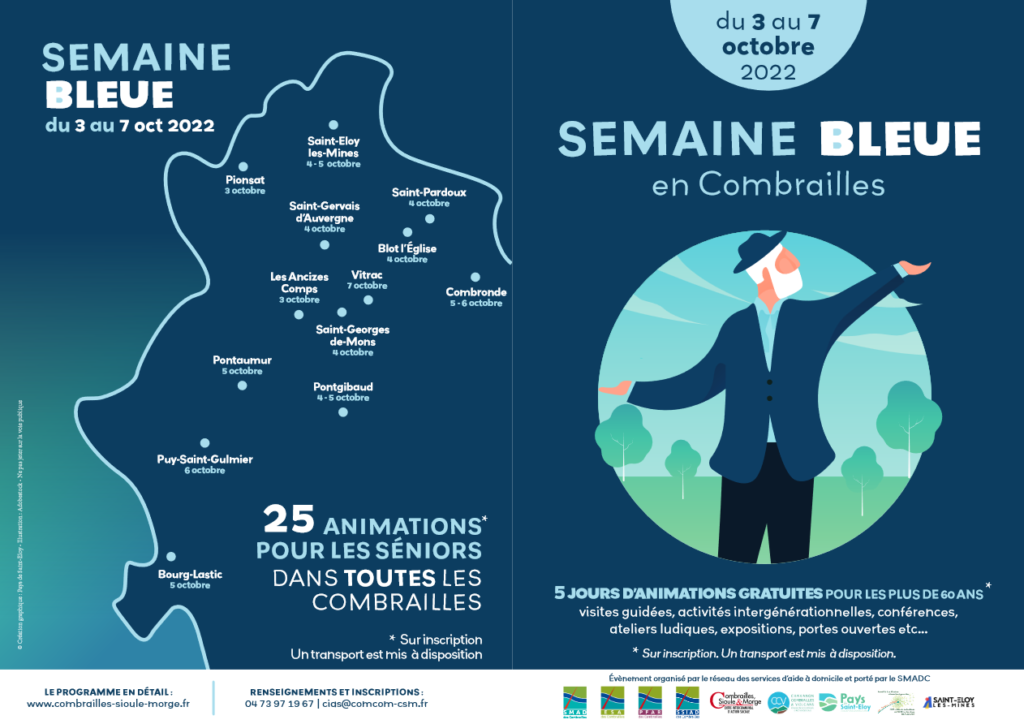 le CIAS Combrailles, Sioule et Morge organise sur son territoire la semaine bleue et propose aux personnes de plus de 60 ans des activités sur l’ensemble de la collectivité. Celle-ci se déroulera du 3 au 7 octobre 2022, un transport est mis à disposition.