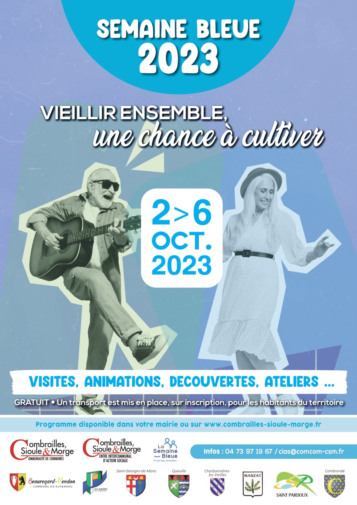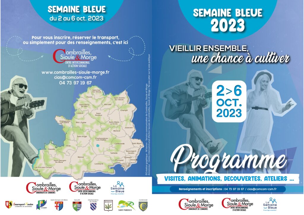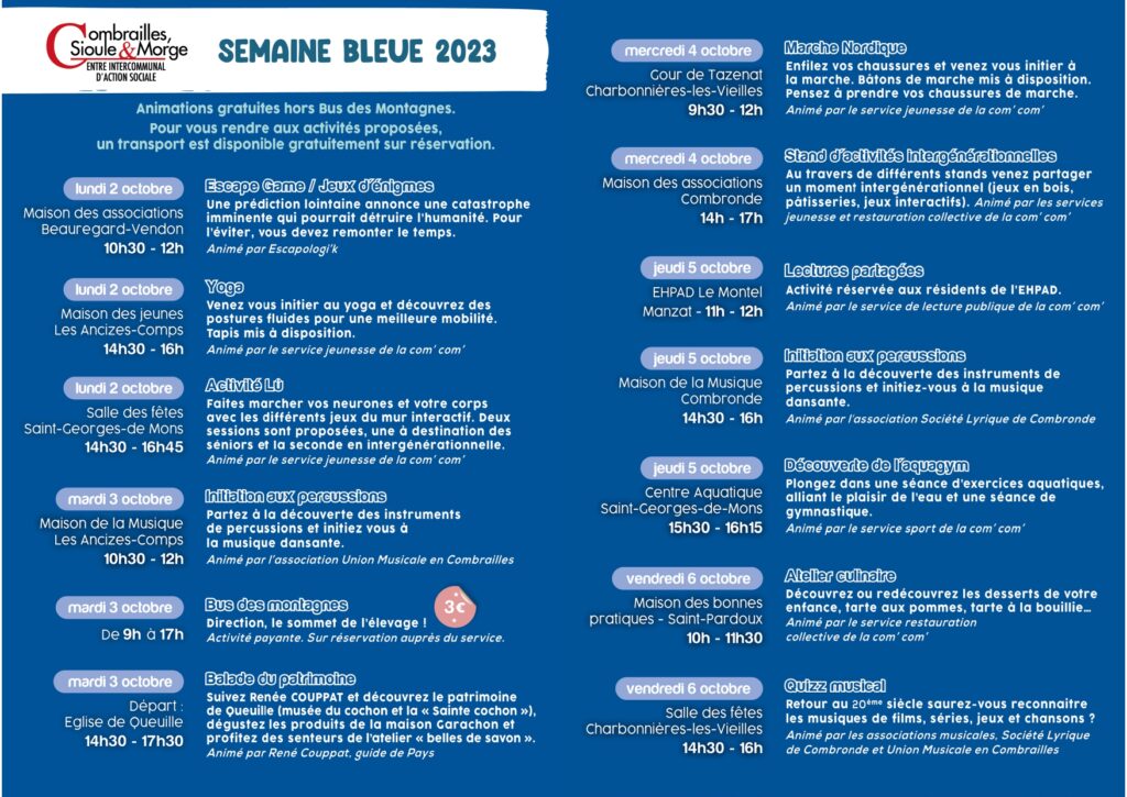 le CIAS Combrailles, Sioule et Morge organise sur son territoire la semaine bleue et propose aux personnes de plus de 60 ans des activités sur l’ensemble de la collectivité. Celle-ci se déroulera du 2 au 6 octobre 2023, un transport est mis à disposition.