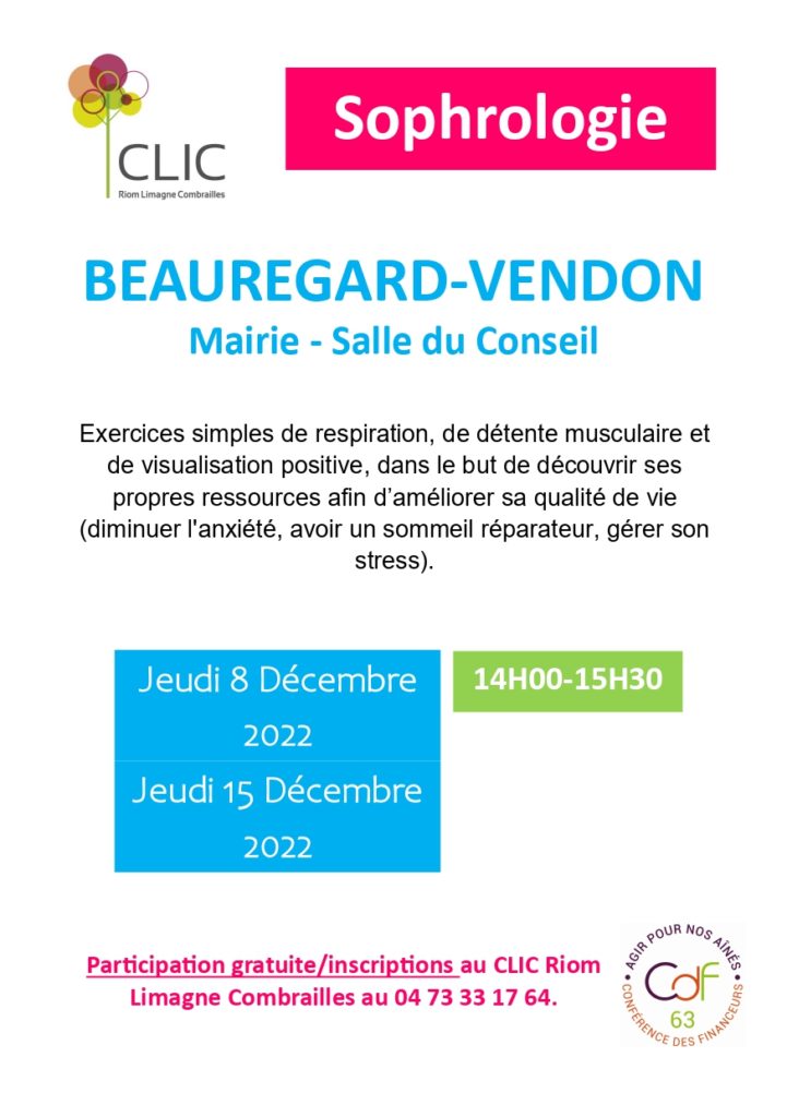 Le Clic de Riom Limagne Combrailles vous propose deux ateliers Sophrologie à la mairie de Beauregard-Vendon le jeudi 08 décembre et le jeudi 15 décembre 2022 de 14h00 à 15h30 (uniquement pour les plus de 60 ans).