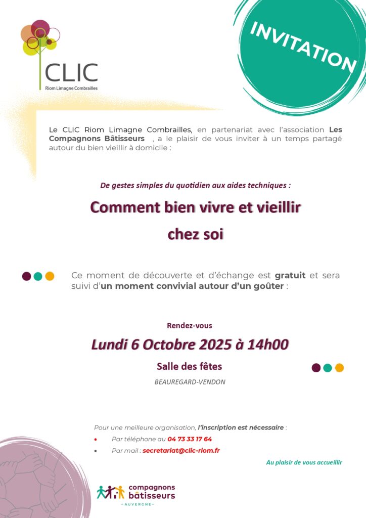 Le CLIC Riom Limagne Combrailles en partenariat avec l’association Les Compagnons Bâtisseurs ont le plaisir de vous inviter à un temps partagé autour du bien vieillir à domicile.