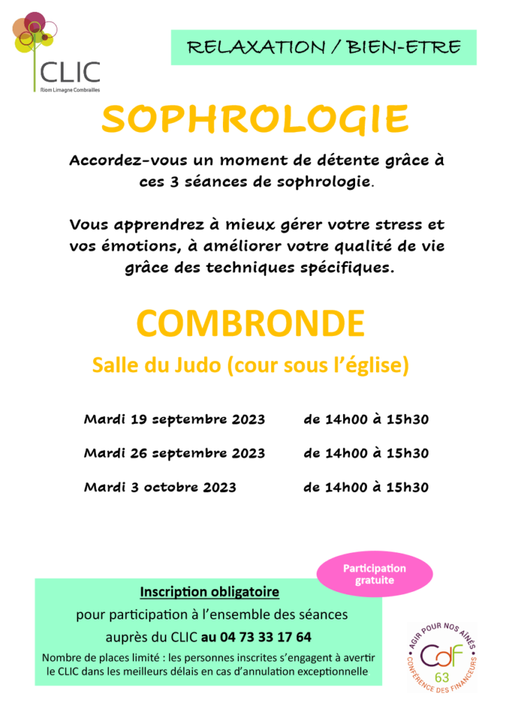Le CLIC Riom Limagne Combrailles et ses partenaires proposent de nouveaux ateliers sophrologie, composés de 3 séances à Combronde. Ouvert uniquement aux séniors de plus de 60 ans. Inscription obligatoire auprès du CLIC au 04-73-33-17-64