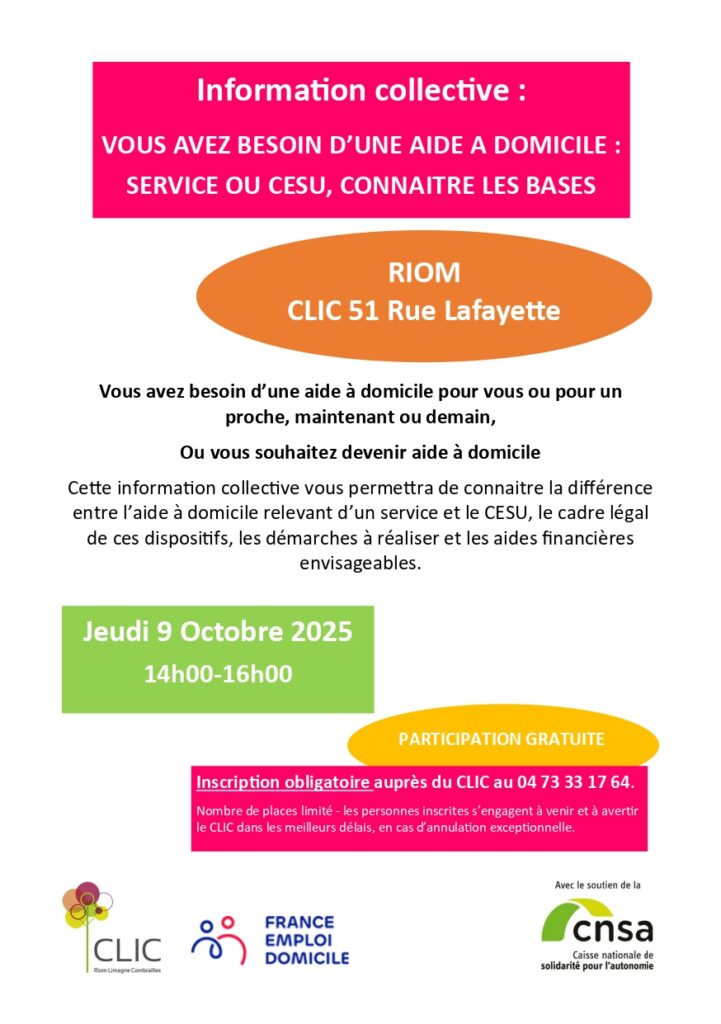 Le CLIC Riom Limagne Combrailles propose une information collective : Vous avez besoin d’une aide à domicile : Service ou CESU, connaître les bases.