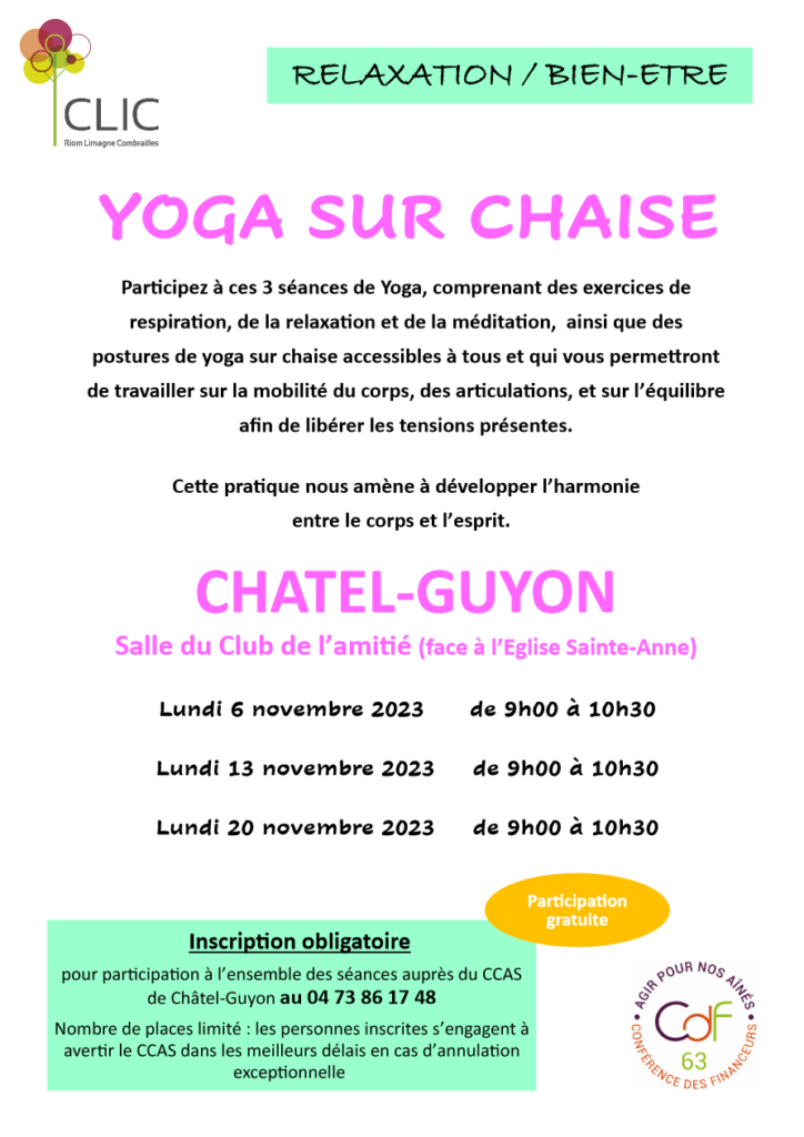 Le Clic Riom Limagne Combrailles vous propose à Chatel-Guyon 3 séances de Yoga sur chaise (ouvert aux seniors de plus de 60 ans) Merci de bien vouloir réserver au 04-73-86-17-48.