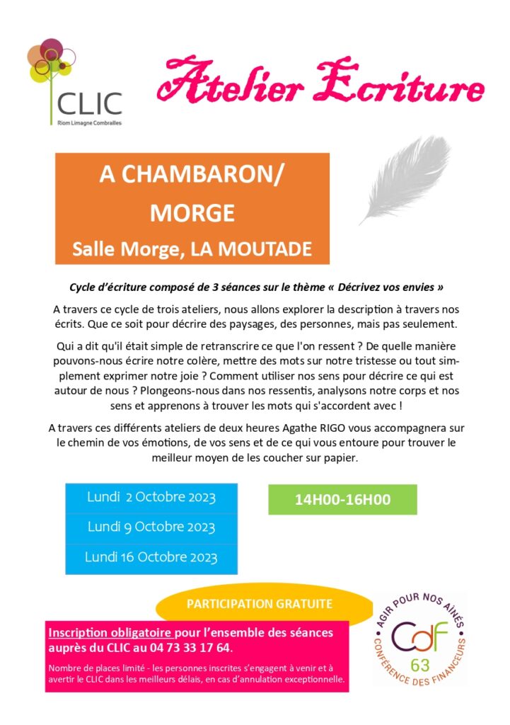 Le Clic Riom Limagne Combrailles vous propose un atelier écriture à Chambaron sur Morge (ouvert uniquement aux seniors de plus de 60 ans). Réservation obligatoire auprès du CLIC au 04-73-33-17-64.
