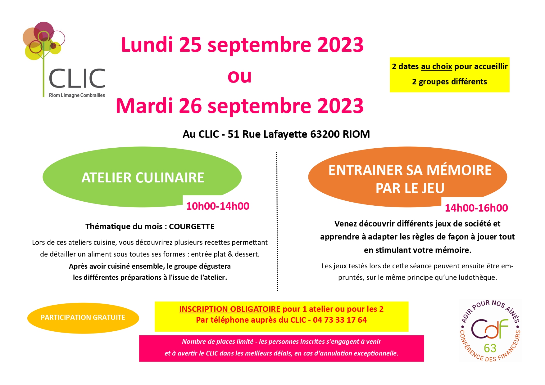Inscription obligatoire auprès du CLIC au 04-73-33-17-64 (ouvert uniquement aux séniors de plus de 60 ans)