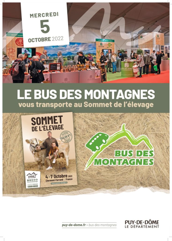 Le Conseil Départemental du Puy de Dôme, dans le cadre du Bus des Montagnes, organise le Bus des Montagnes au Sommet de l’élevage, qui se déroulera le mercredi 5 octobre 2022.
