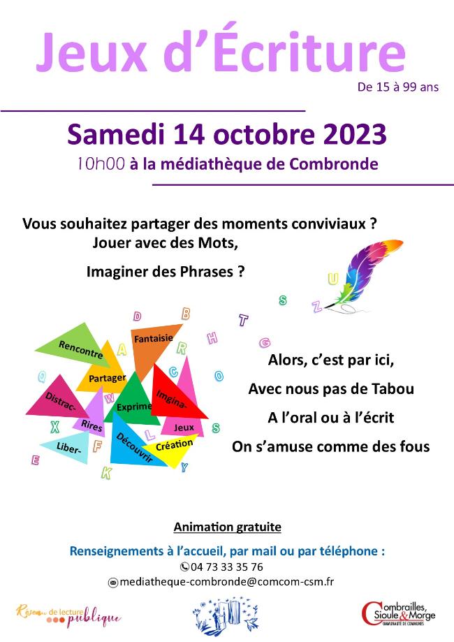 Le réseau de lecture publique Combrailles Sioule et Morge vous propose le samedi 14 octobre 2023 à partir de 10h00 à la médiathéque de Combronde des ateliers d’écriture.