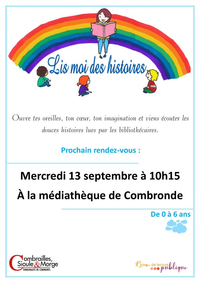 Le réseau de lecture publique Combrailles, Sioule et Morge vous donne rendez-vous pour venir écouter des histoires lues par Laurette le : Mercredi 13 septembre à 10h15 A la médiathèque de COMBRONDE