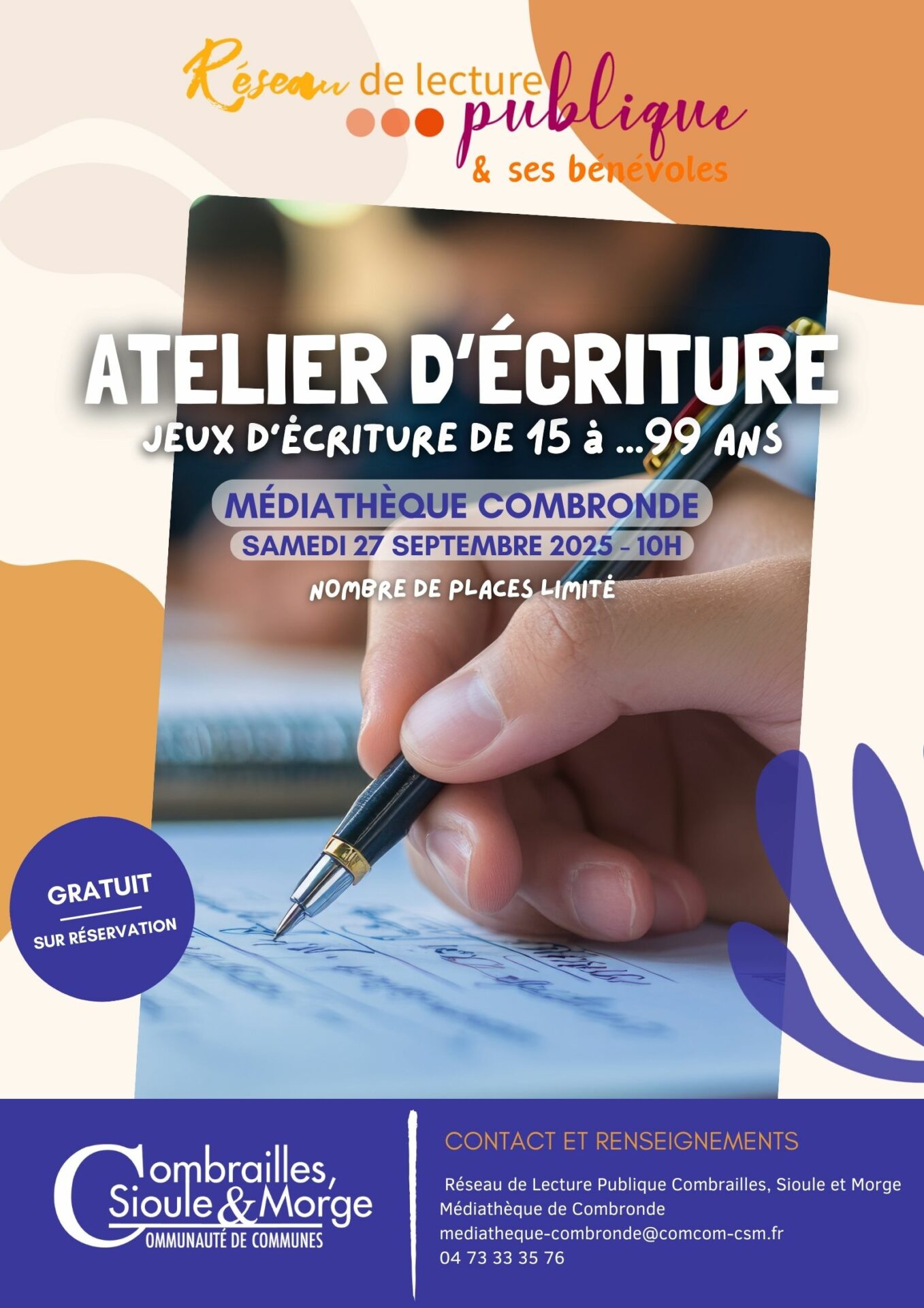 Le réseau de lecture publique Combrailles Sioule et Morge vous propose des ateliers d’écriture le samedi 27 septembre 2025 A 10h00 à la médiathèque de Combronde.