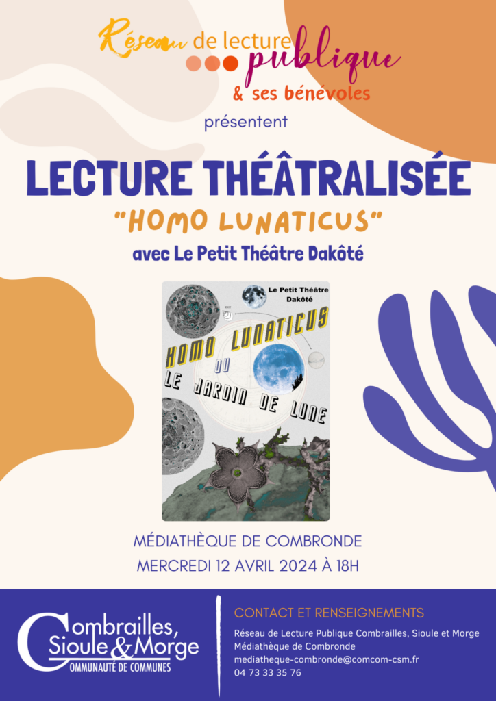 Le Réseau de lecture publique et Combrailles, Sioule et Morge vous invite à une lecture théâtralisée loufoque, Homo Lunaticus, par la Compagnie Le Petit Théâtre Dakôté, vendredi 12 avril 2024 à 18h à la médiathèque de Combronde, pour petits et grands !