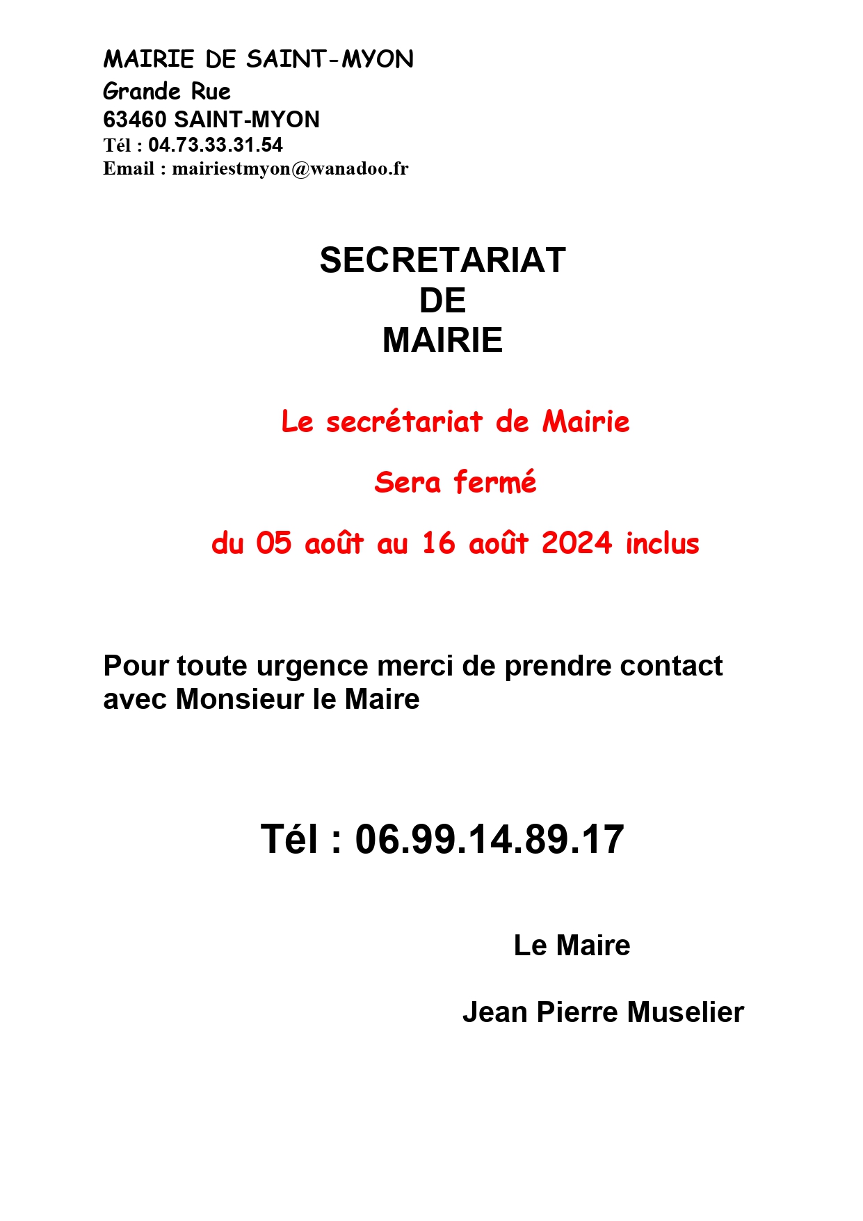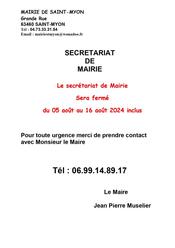 Le secrétariat de Mairie sera fermé du 05 août au 16 août 2024
