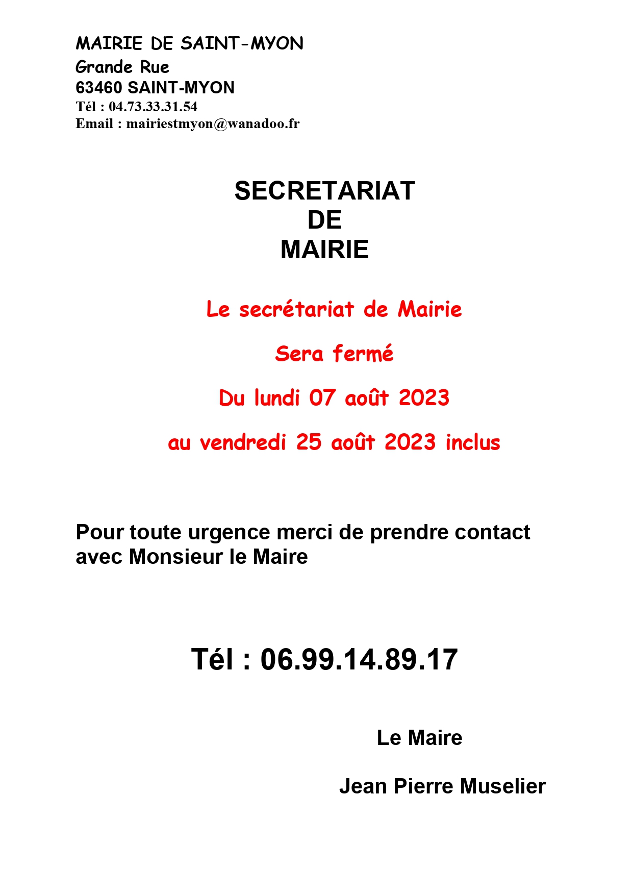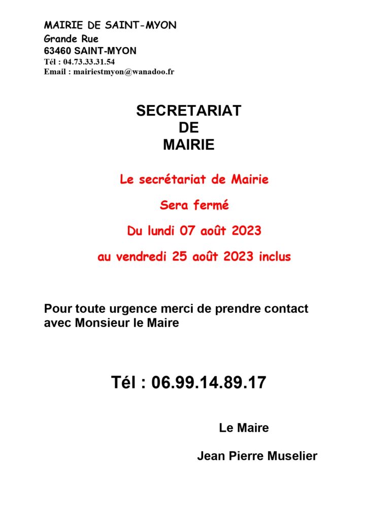 Le secrétariat de Mairie sera fermé du lundi 07 août au vendredi 25 août inclus.