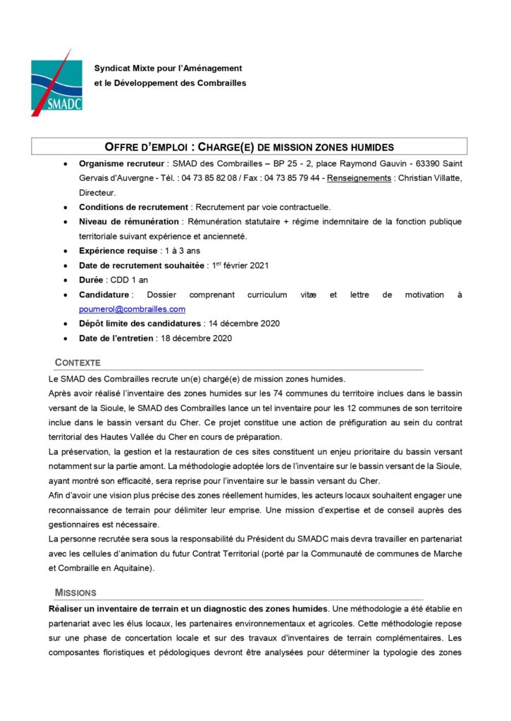Le Syndicat Mixte pour l’Aménagement et le développement des Combrailles recrute un (e) chargé(e) de mission Zones humides.