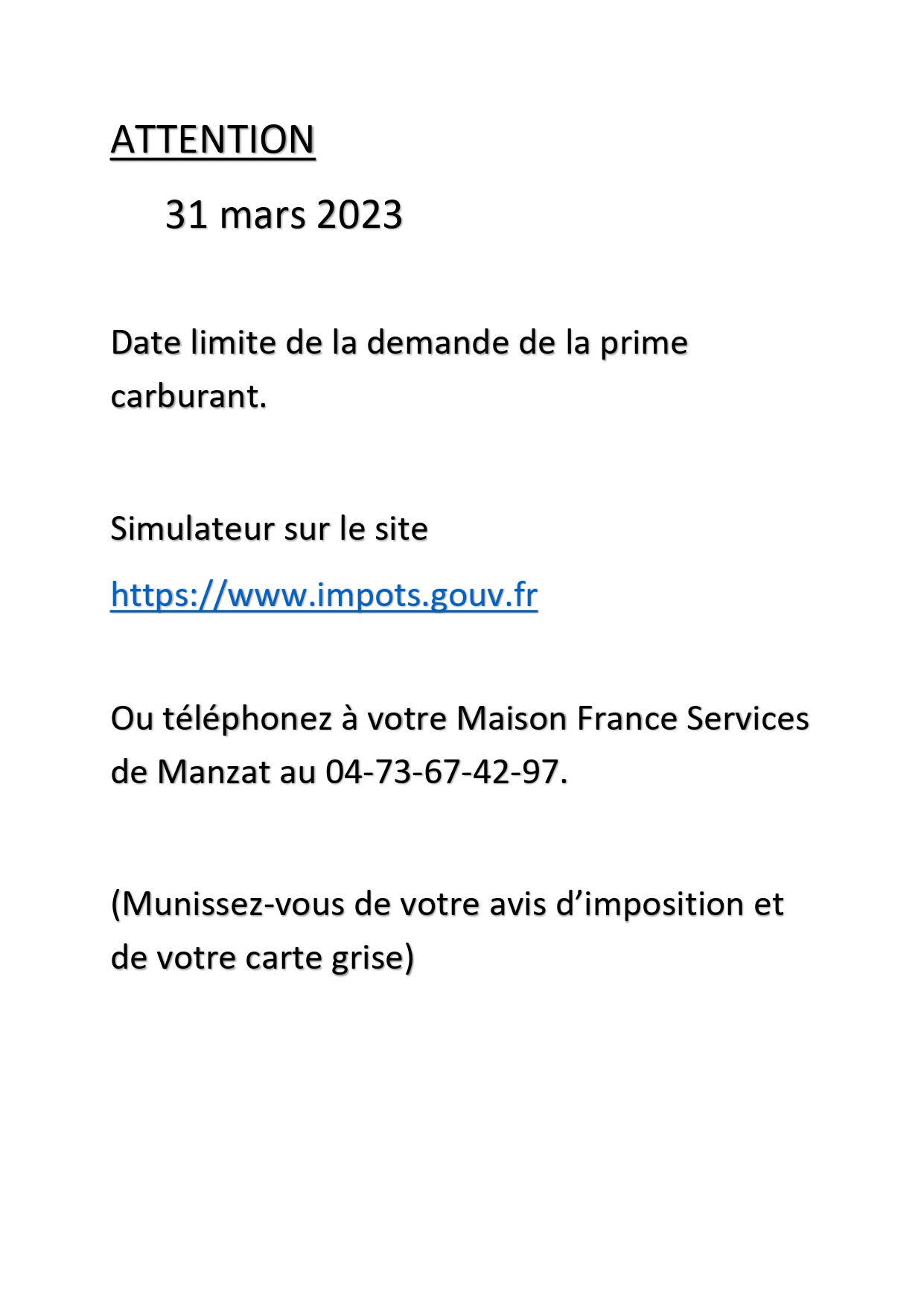 Maison France Services de Manzat vous propose de vous accompagner pour la prime Carburant date limite le 31 Mars 2023 Partager : Communauté