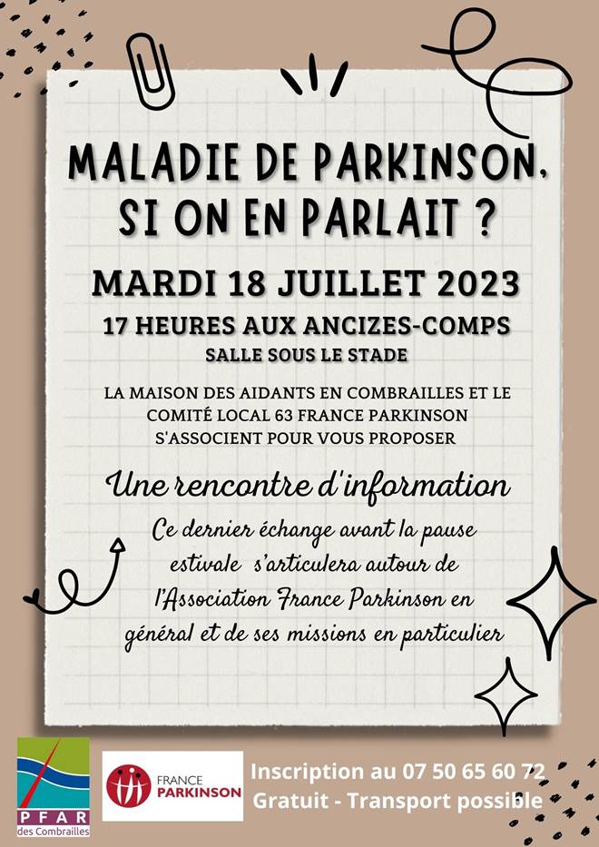La maison des aidants en Combrailles et le comité local 63 France Parkinson s’associent pour vous proposer une rencontre d’information le Mardi 18 juillet 2023 à 17h00 aux Ancizes-Comps
