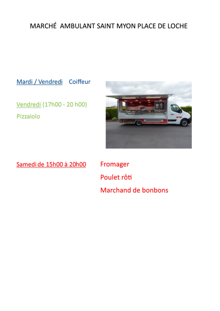 Veuillez trouver ci-dessous les jours et les horaires des marchands ambulants de Saint-myon place de Loche.