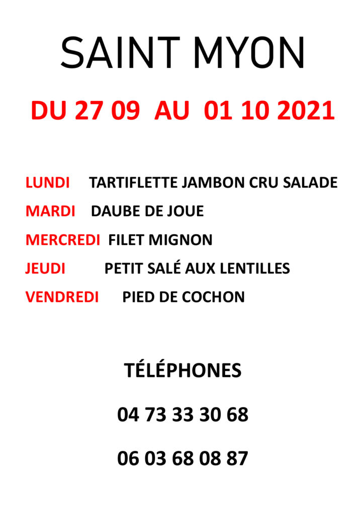 Menu auberge des sources du lundi 27 septembre au vendredi 01er octobre 2021