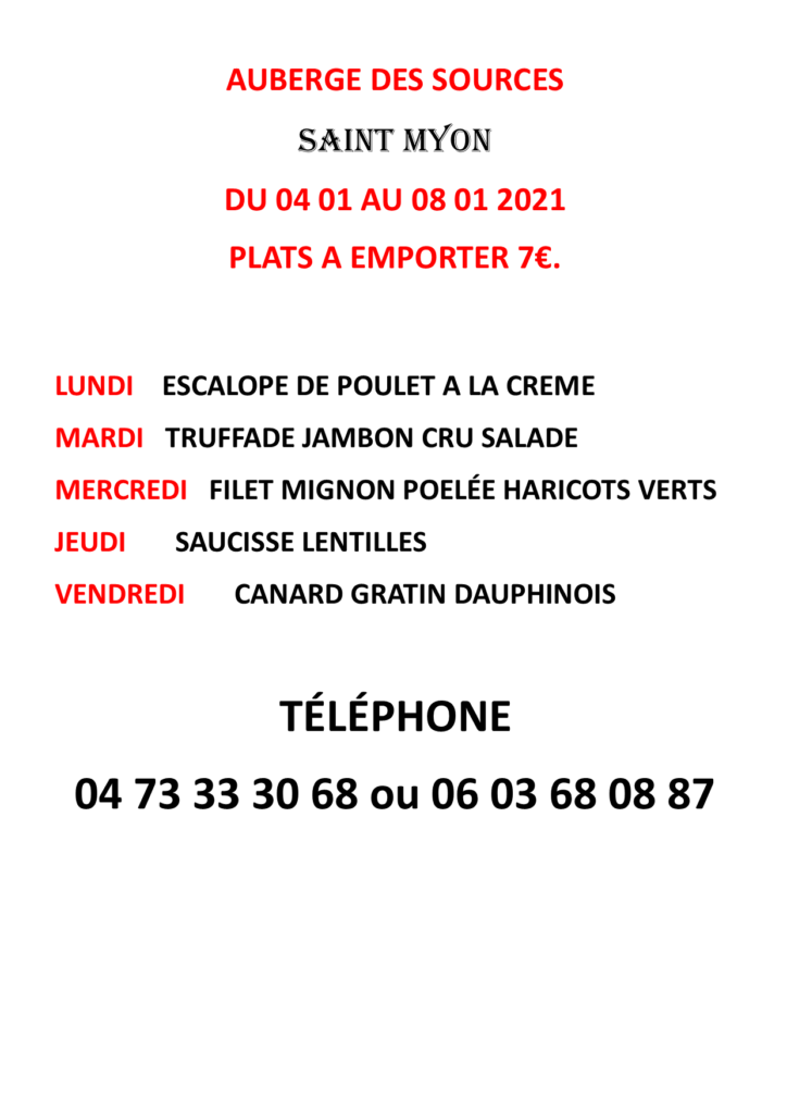Menu de l’Auberge des Sources du 04 janvier au 08 janvier 2021