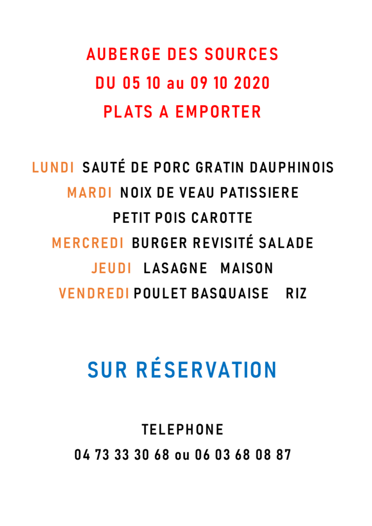 Menu de l’auberge des sources du 05 octobre au 09 octobre 2020